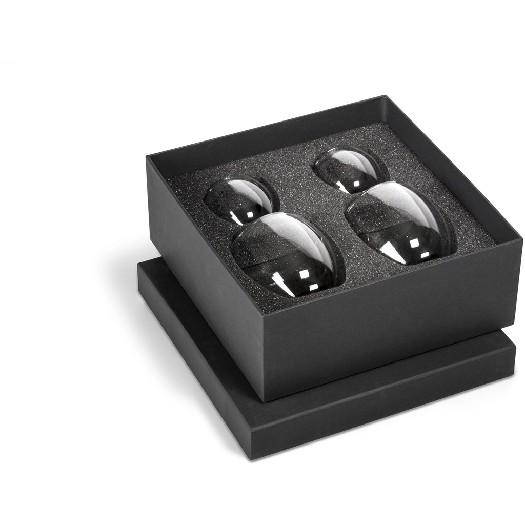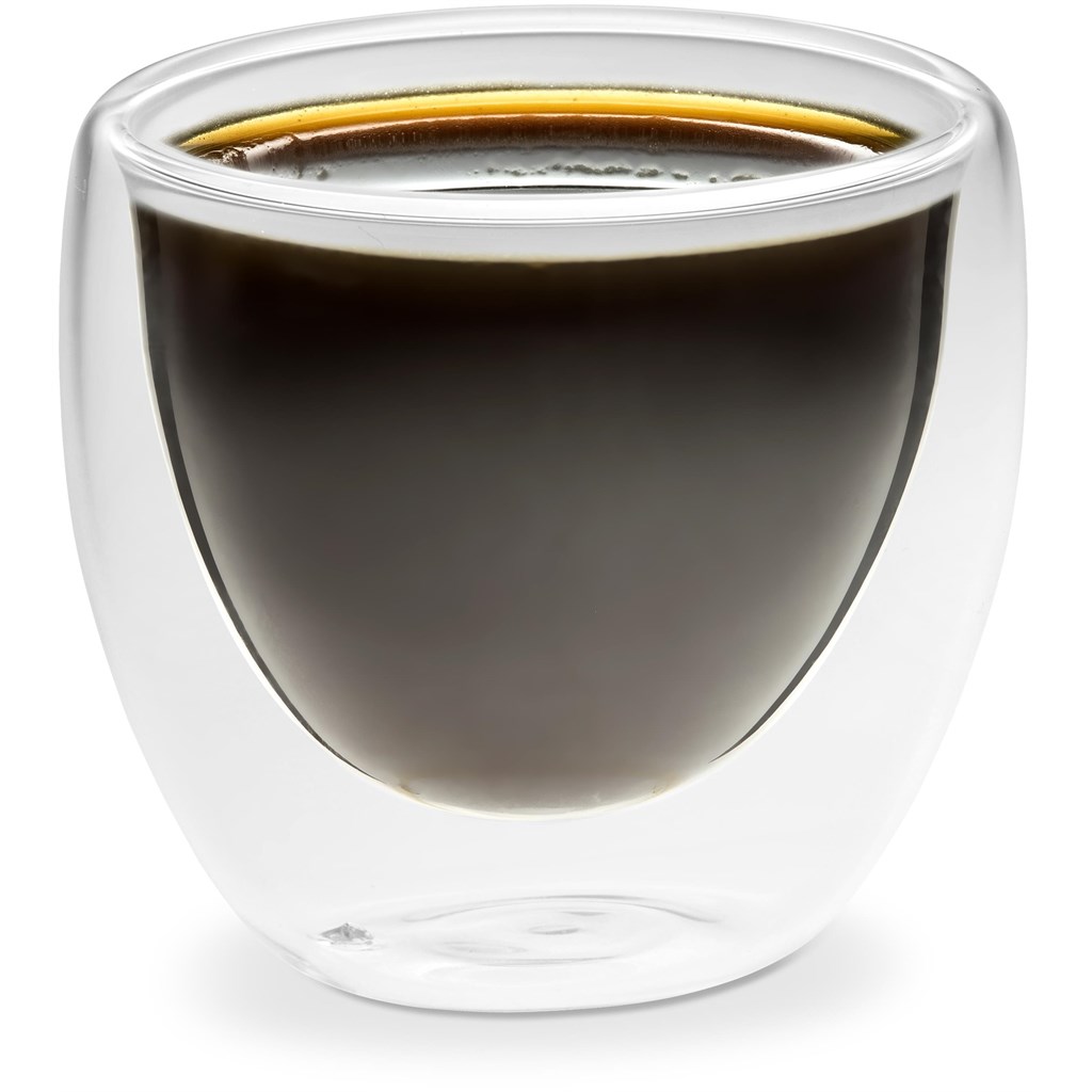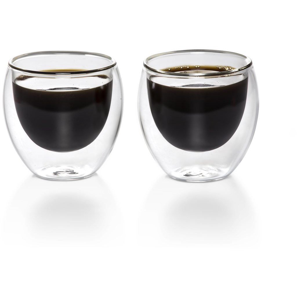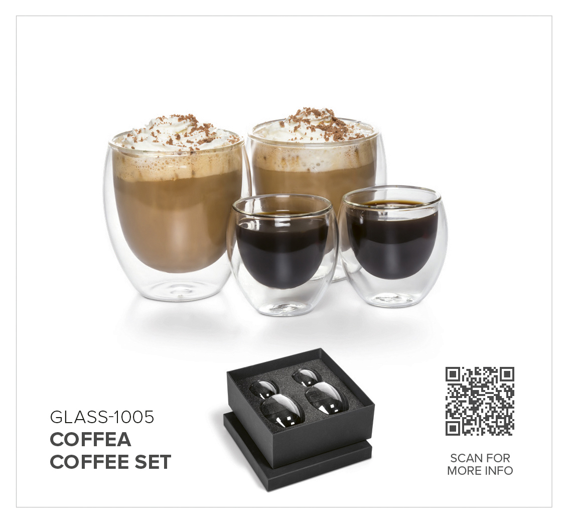 This deluxe luxury coffee set includes two 240ml double-wall glass coffee cups and two 70ml double-wall glass espresso cups, presented in a black 2-piece gift box.