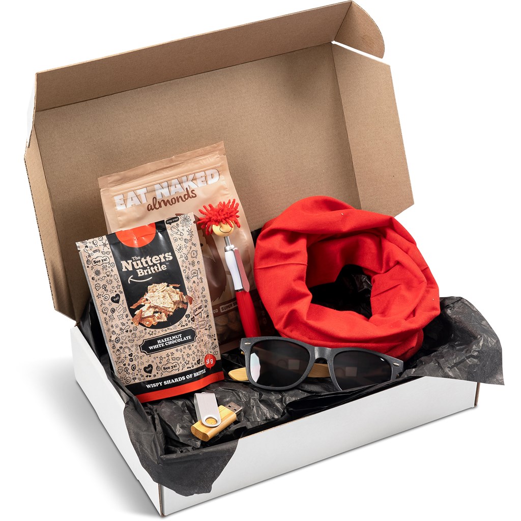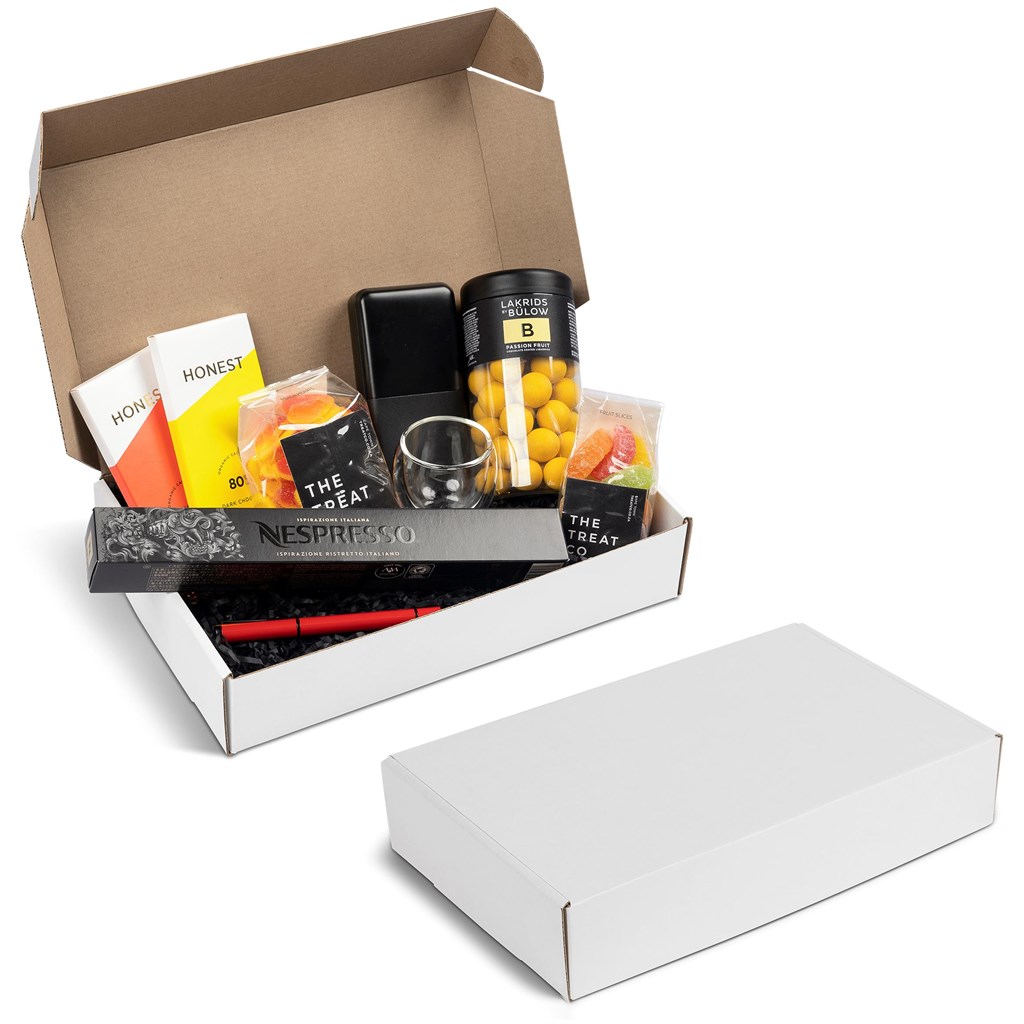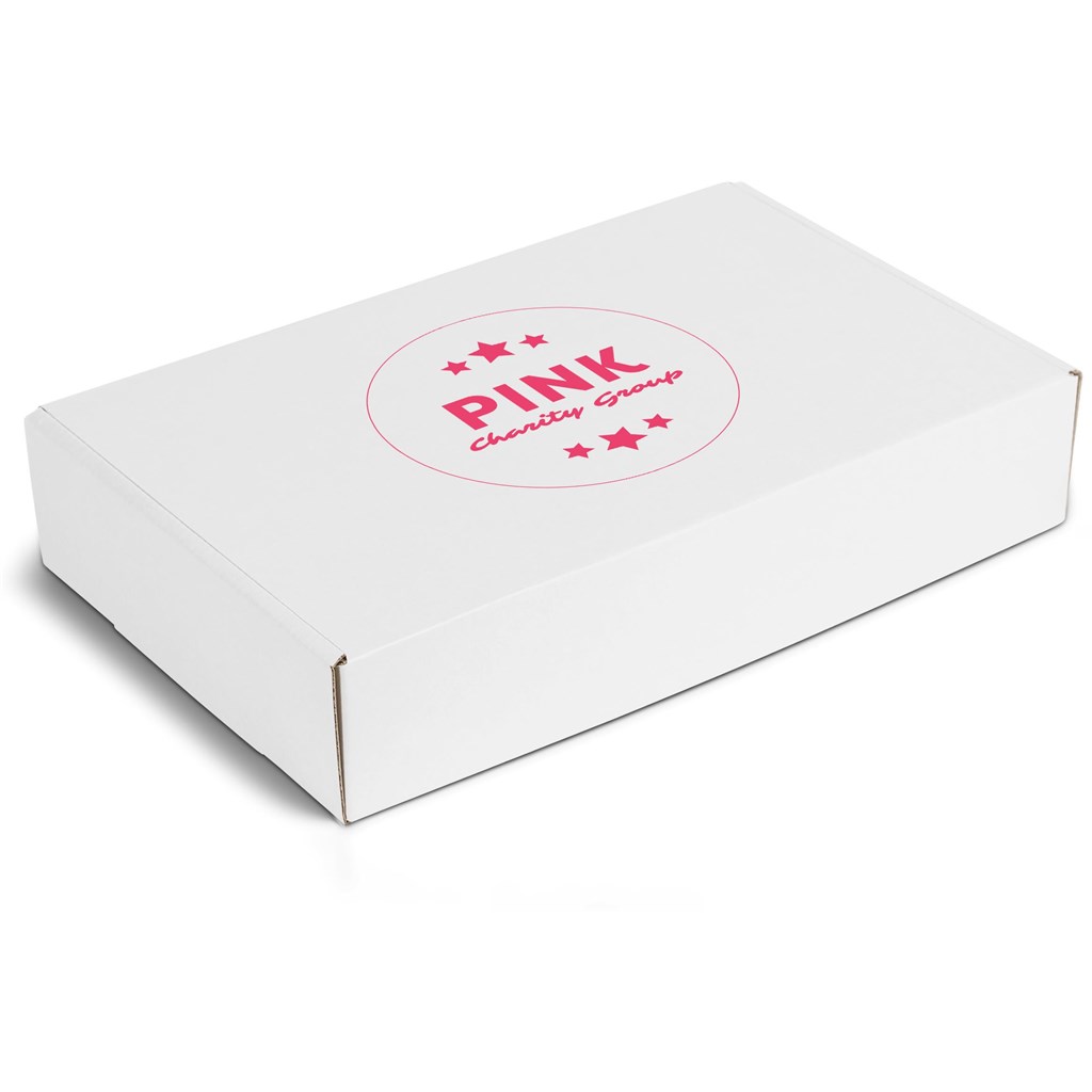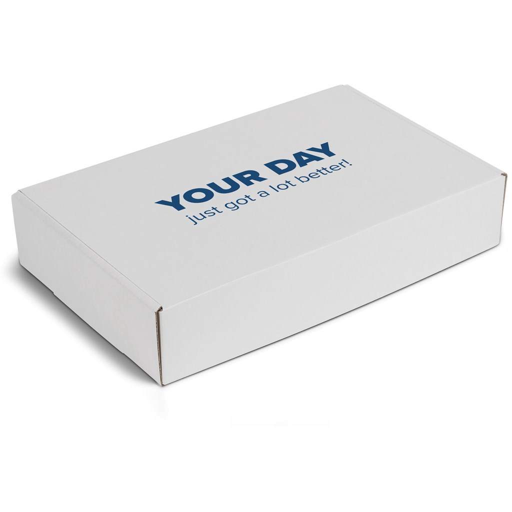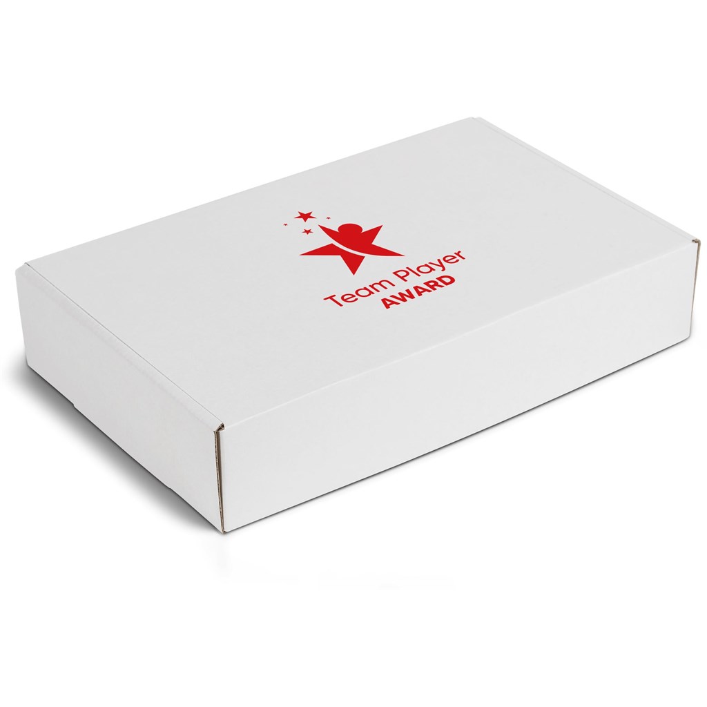 Consider creating your own gift set by packaging items together in a gift box branded with your logo or message. You can also add shredded paper filler or tissue paper to your gift set. Simple 1-colour, 1-position branding is available on this white box. If you’d like larger coverage, full-colour branding, then please consider the PG-AM-406-B natural kraft box.