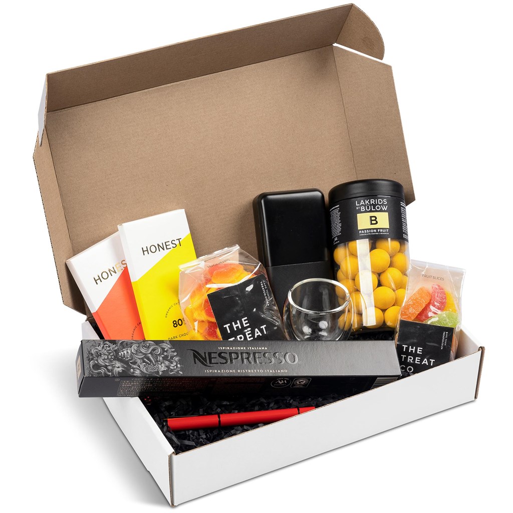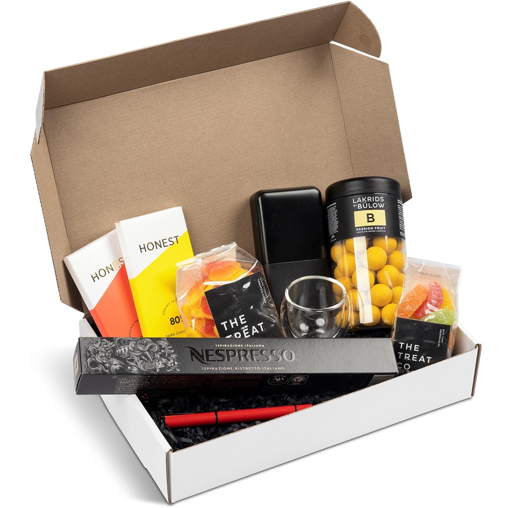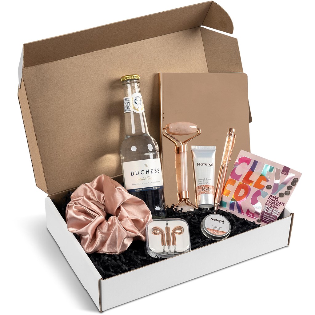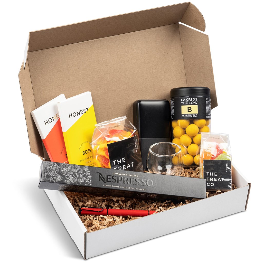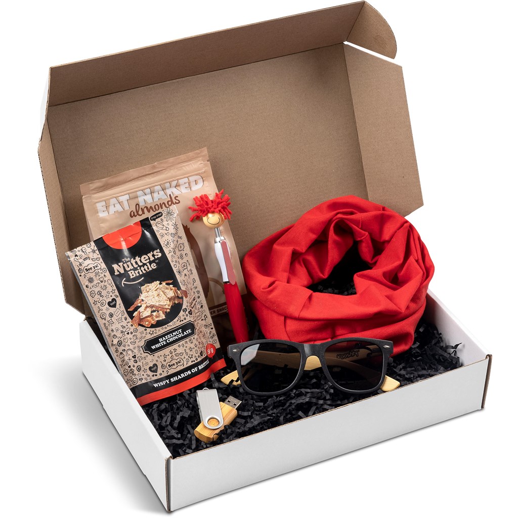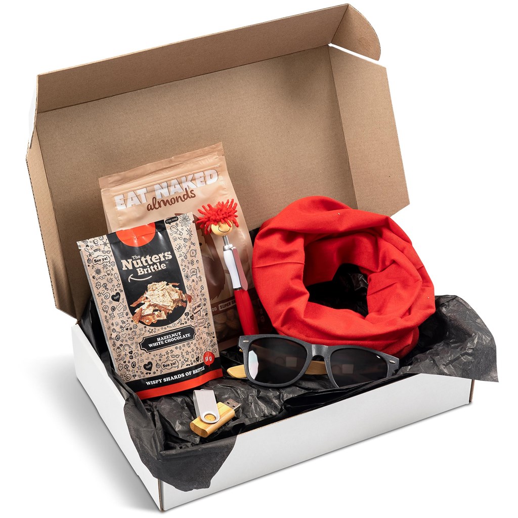 Consider creating your own gift set by packaging items together in a gift box branded with your logo or message. You can also add shredded paper filler or tissue paper to your gift set. Simple 1-colour, 1-position branding is available on this white box. If you’d like larger coverage, full-colour branding, then please consider the PG-AM-406-B natural kraft box.