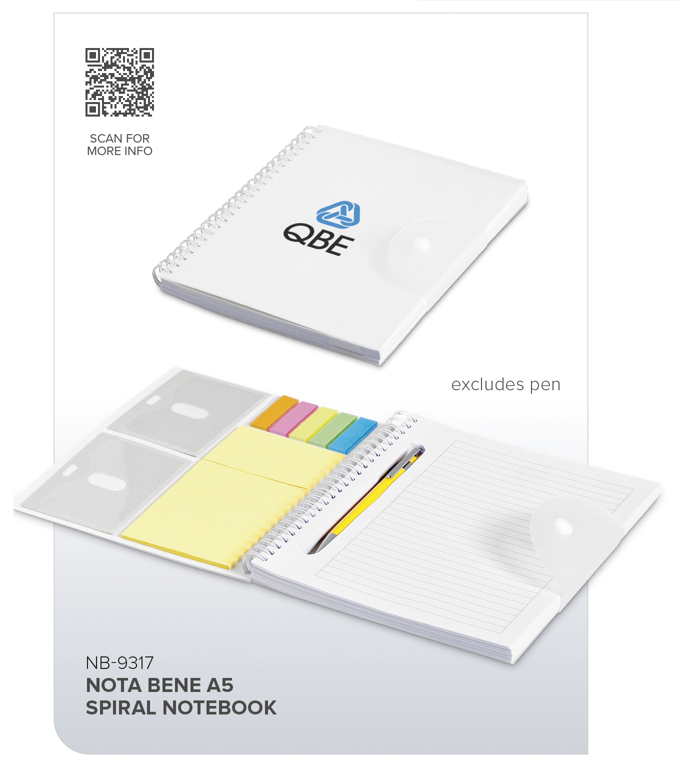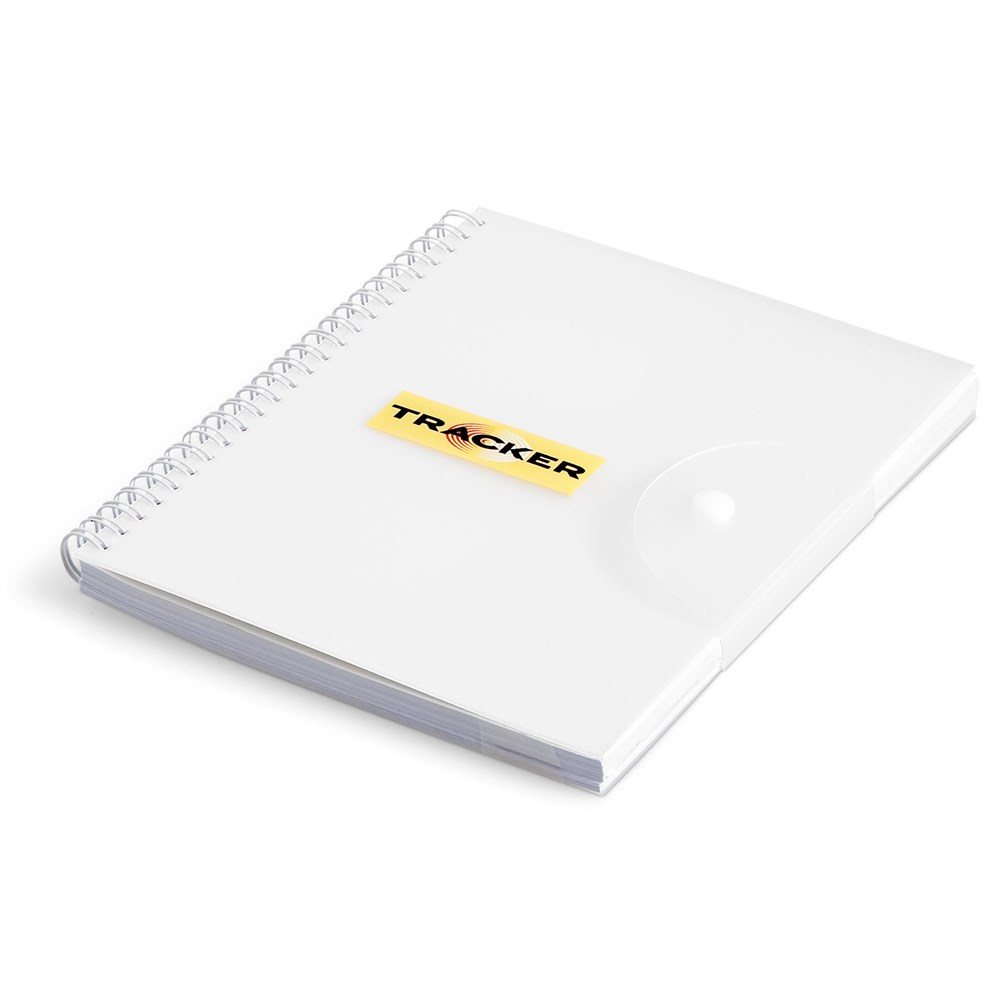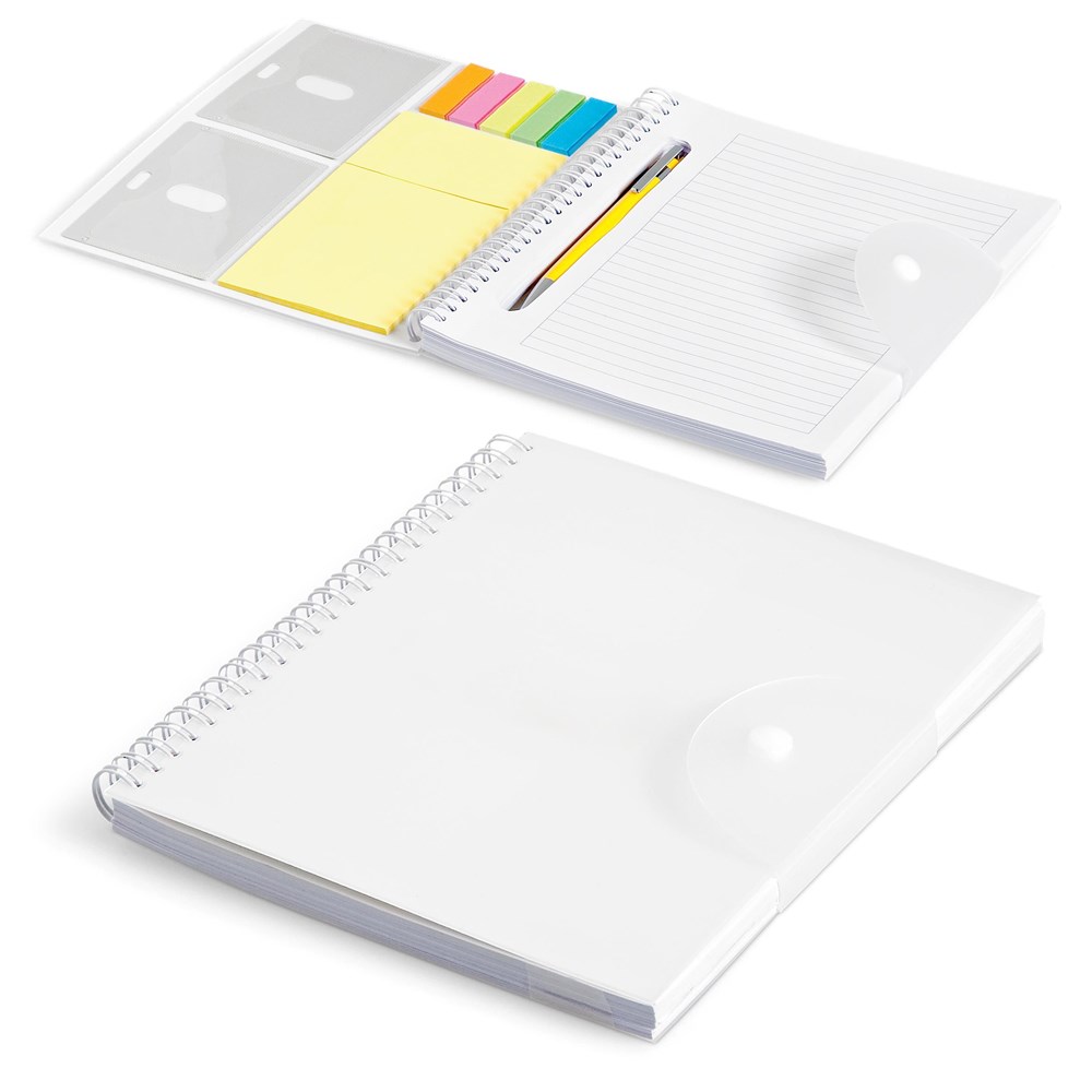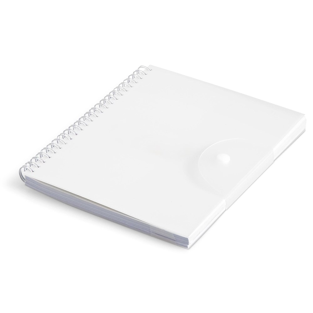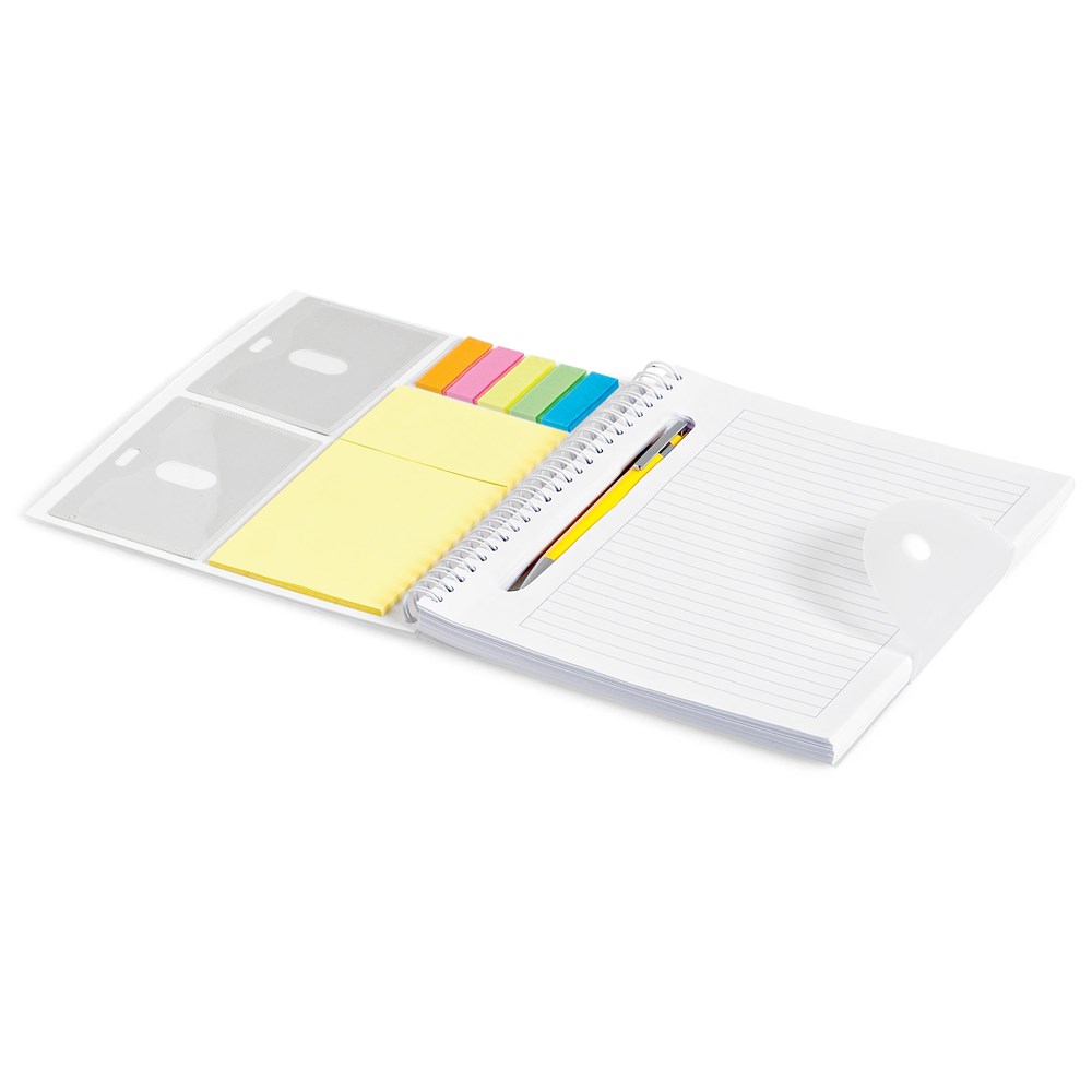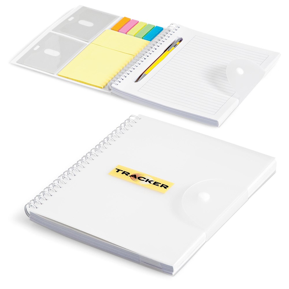 This spiral-bound, multi-feature notebook has a frosty plastic cover with a snap closure. The paper has a recessed housing for a pen (excluded), and also included are 2 business card slots, assorted colour sticky tags and 2 sets of pale yellow sticky notes.
