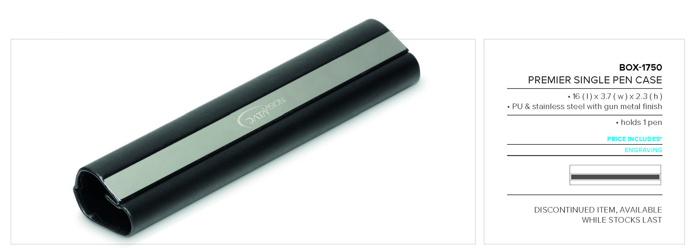This magnificent case holds 1 pen. Unique shape. Gun metal plaque great for engraving on. Magnetic closure.