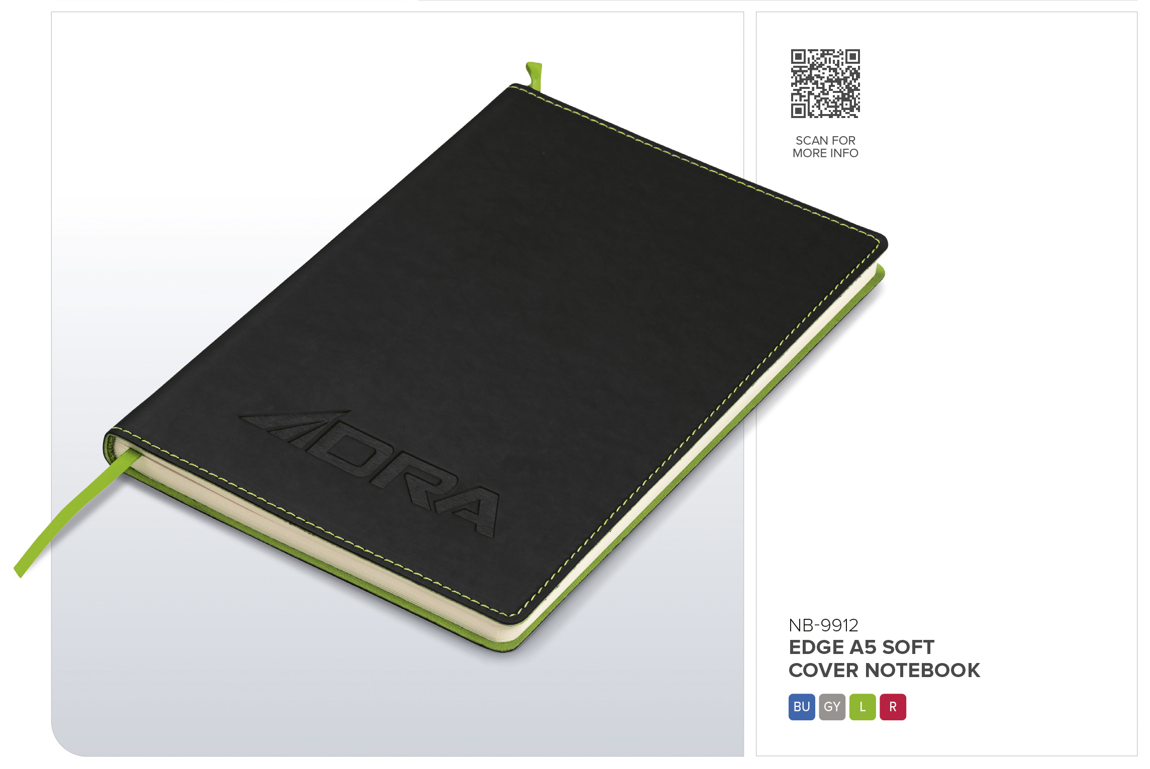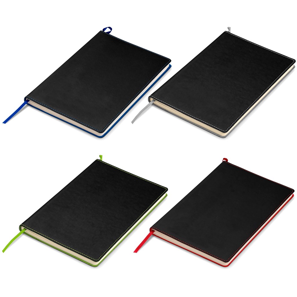 Colour is subtly brought through in this notebook through the matching ribbon, cover inner and border stitching. Match it to your logo for best effect.